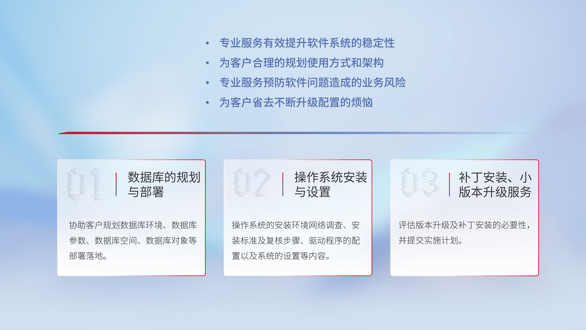 为客户提供软件规模升级、、快速部署、、、按需配置的专业服务,,,从数据库的规划与部署到操作系统的安装与设置,,再到补丁安装和小版本升级提供支持。。
